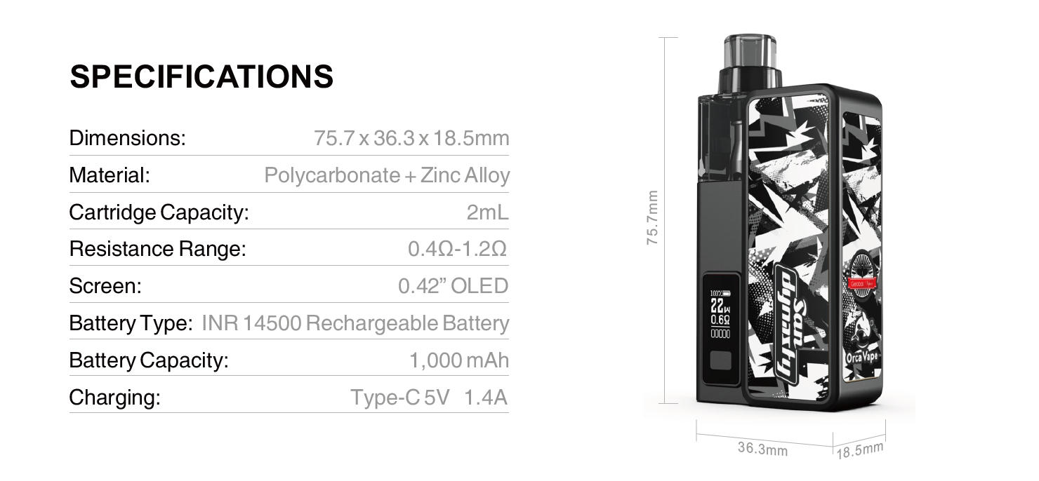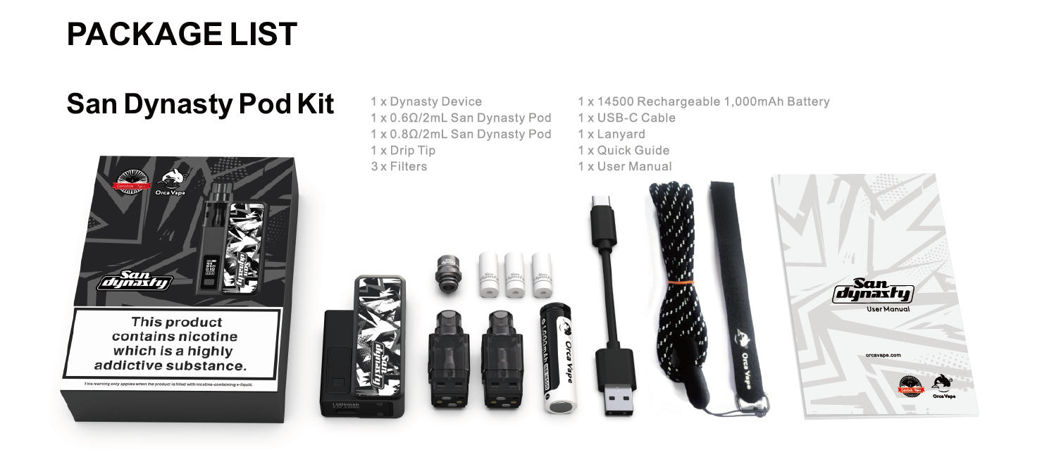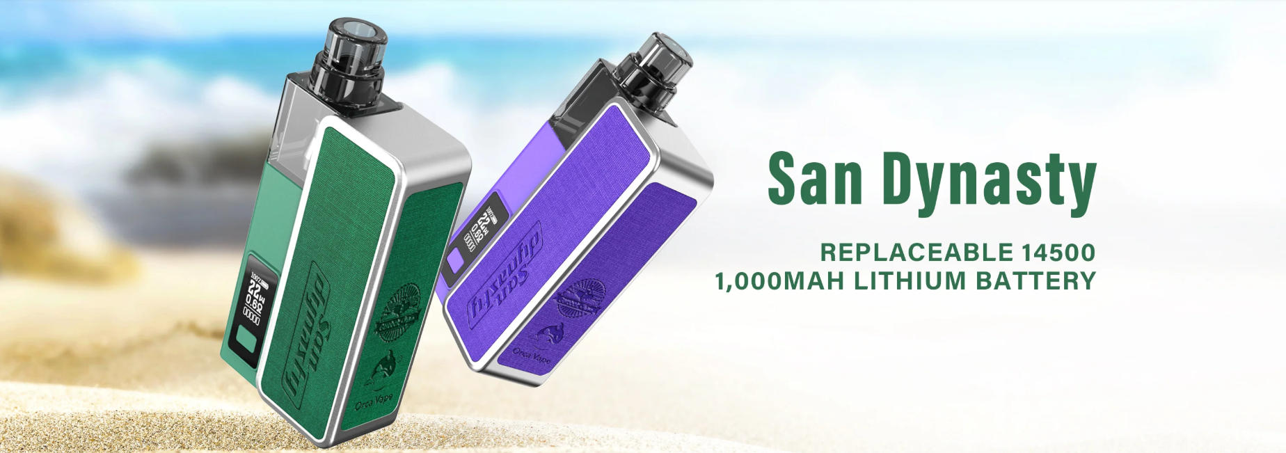 Orca Vape X Gerobak 的 San Dynasty Pod Kit 套装采用可充电、可拆卸的 14500 电池,提供 1000mAh 的可靠电量,带来精湛的蒸汽体验。套装配备可调节的进气控制,用户可定制抽吸体验,获得顺滑的口吸体验或更强劲的口感。它非常适合 50/50尼古丁盐烟油,带来快速的尼古丁满足感和浓郁的口感。