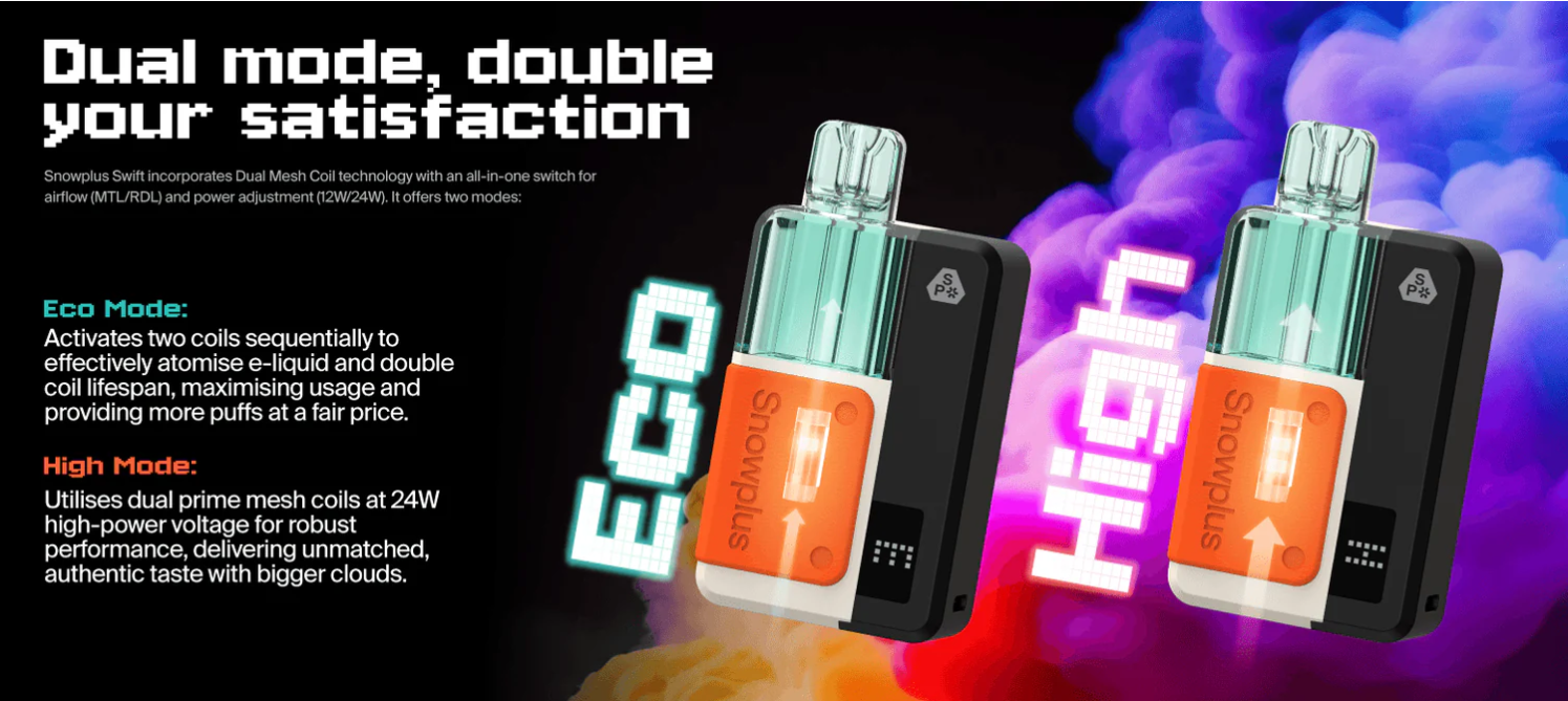 雪加积木Snowplus Swift具有吸气激活系统、可调节气流和双网状线圈,可提供顺畅、自然的 MTL(口对肺)吸入,并具有持续饱满的烟雾输出,借助两种功率输出模式(环保模式和增强模式),你可以随意调节出烟大小。此外,清晰的 LED 显示屏可让您随时了解电池电量和工作状态。